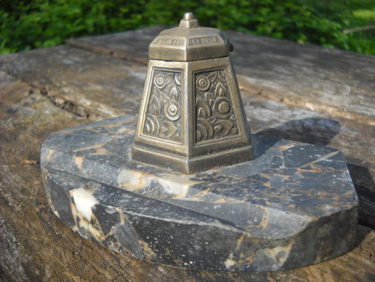 French Vintage Decorative Desk Inkwell Bronze Art Deco Pen Stand Encrier on Marble True Art Deco Inkwell Lovely Piece