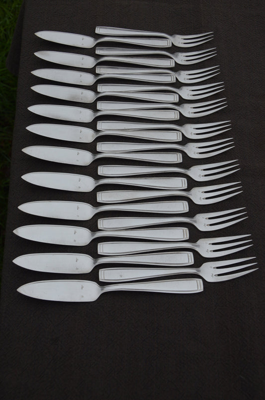 Devouge Pierre Devouge & Dupont Paris Stamped PD 12 6+6 Silver Plated 'Metaille Blanc' Fish Knives and Forks Fully Marked Silver Plate