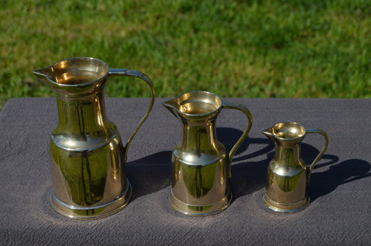 Antique Français Pichets en Bronze Poli Massif Pichets en Bronze Lourd Poignée de Balayage Totalement Fabriqués à la Main Fabuleux Pichets Français Ensemble de Trois