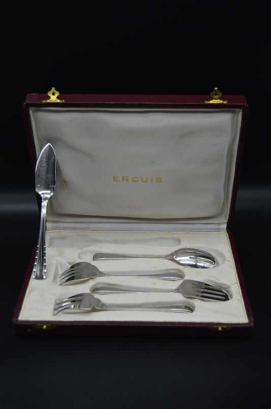 Ercuis Argent Plaqué 'Métaille Blanc' Coffret Hors d'Oeuvres Buffet Sweet Serveurs Cuillère Couteau Pelle Fourchettes Cinq Pièces Ercuis de Paris Coffret