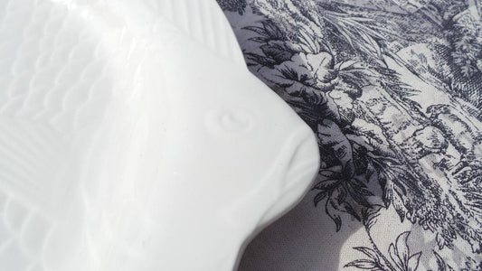 vintage Français Sarreguemines Assiette à poisson pour poisson en forme de carpe années 1930 à 1950 Français Céramique Belle Manufacture Blanc