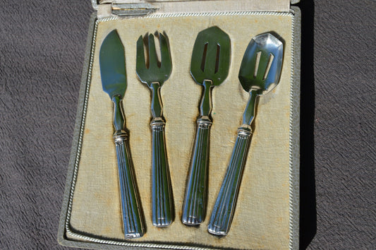 Ercuis Argent Plaqué 'Métaille Blanc' Coffret Hors d'Oeuvres Buffet Sweet Serveurs Cuillère Couteau Pelle Fourchettes Cinq Pièces Ercuis de Paris Coffret