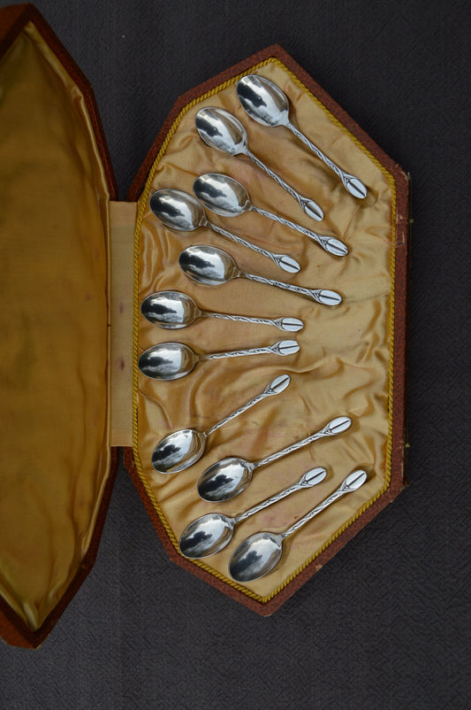 Cuillères en boîte plaquées argent Antique Français Bundle de 11 cuillères à café plaquées argent « Métaille Blanc » avec qualité de fleuron de haricot