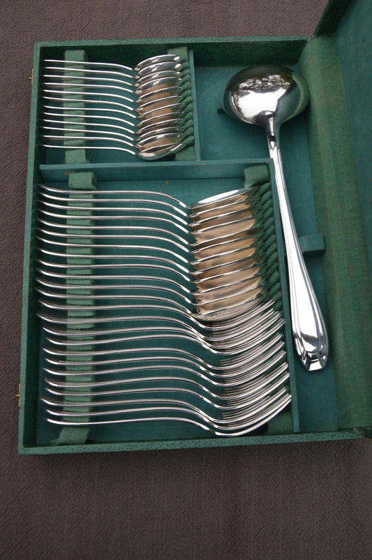 Orbrille JB Luncheon Dessert Box 37 Pieces Forks Spoons Teaspoons Ladle Fully Marked Joseph Buisson French Silver Plate Cutlery Set