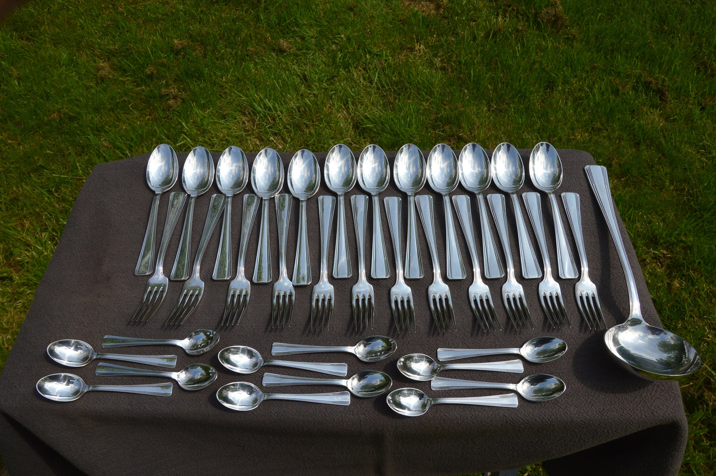 Ils pèsent 3,57 kilos 7 lbs 14 oz, c'est donc un ensemble de couverts substantiel. Comme pour les couverts français Dessert, Pudding ou Déjeuner, il n'y a pas de couteau mais ont en prime une louche.