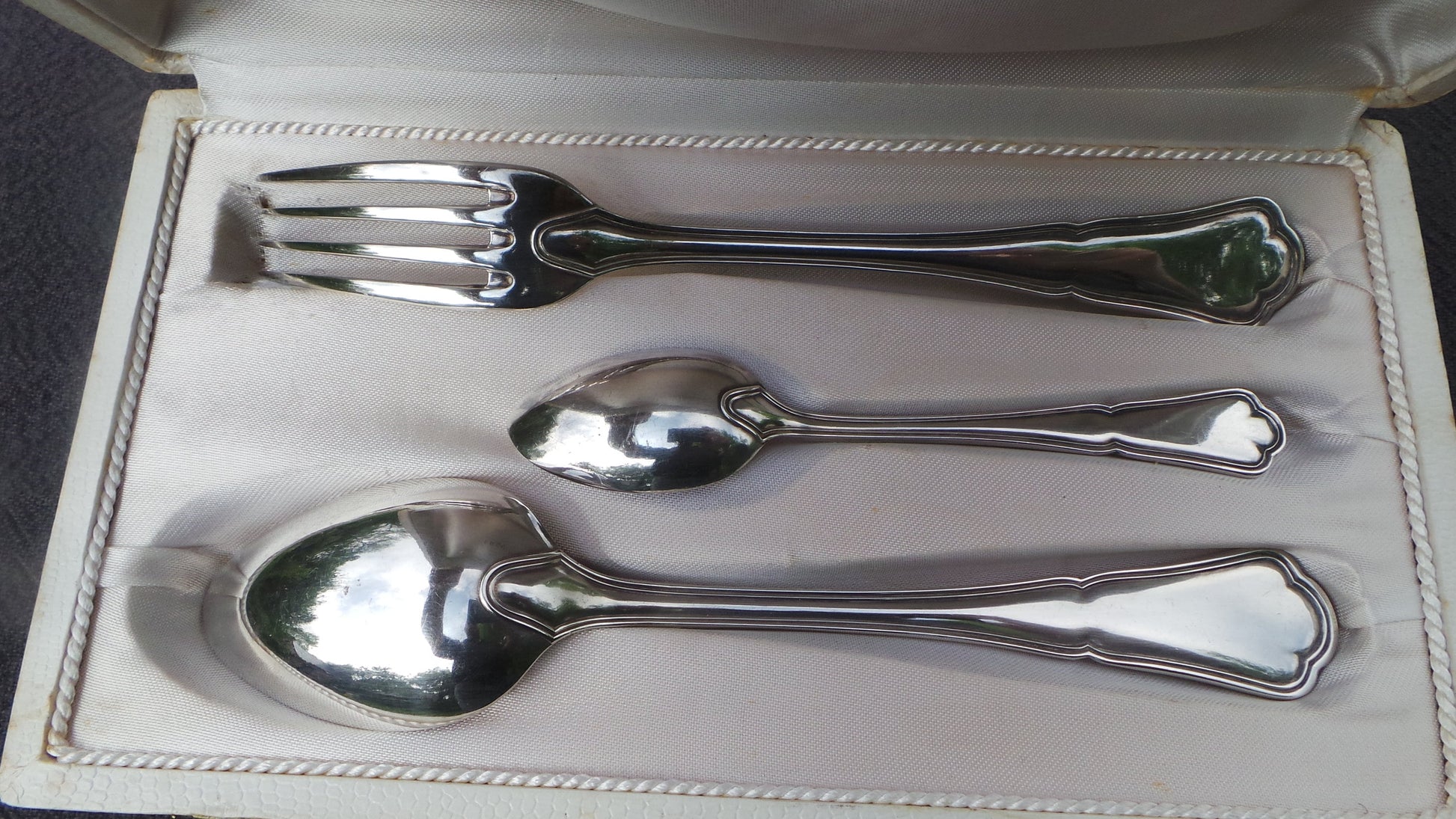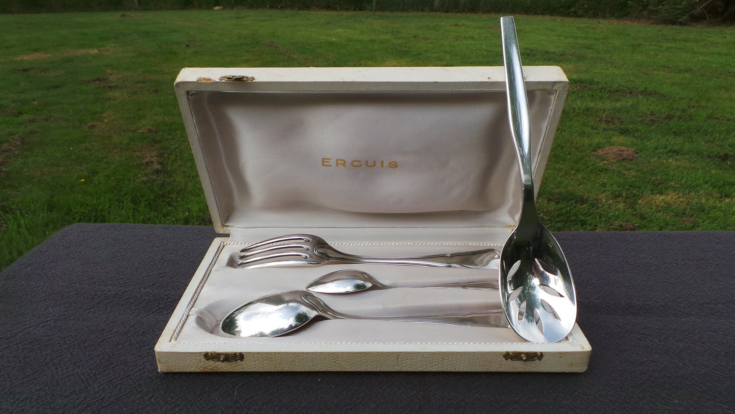 Ercuis Argent Plaqué 'Métaille Blanc' Boîte Cuillère à Café, Fourchette et Cuillère Bonus Cuillère à Fruits Véritable Luxe Fabriqué par Ercuis de Paris