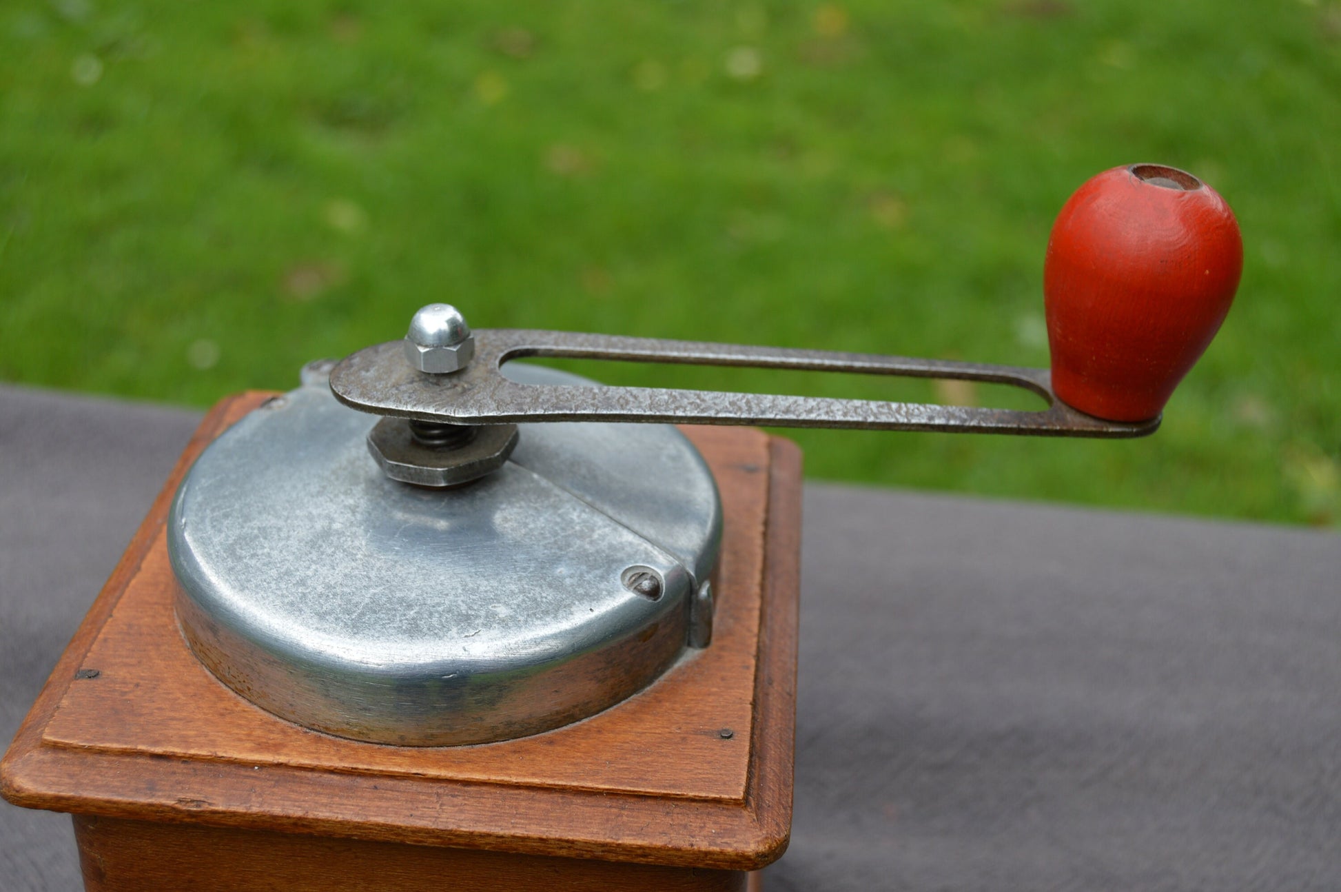 vintage Français LMP Coffee Grinder Metal Handle Attachments Red Knob Entièrement fonctionnel Moulin à Café Poli Some Rust Coffee Bean Mill