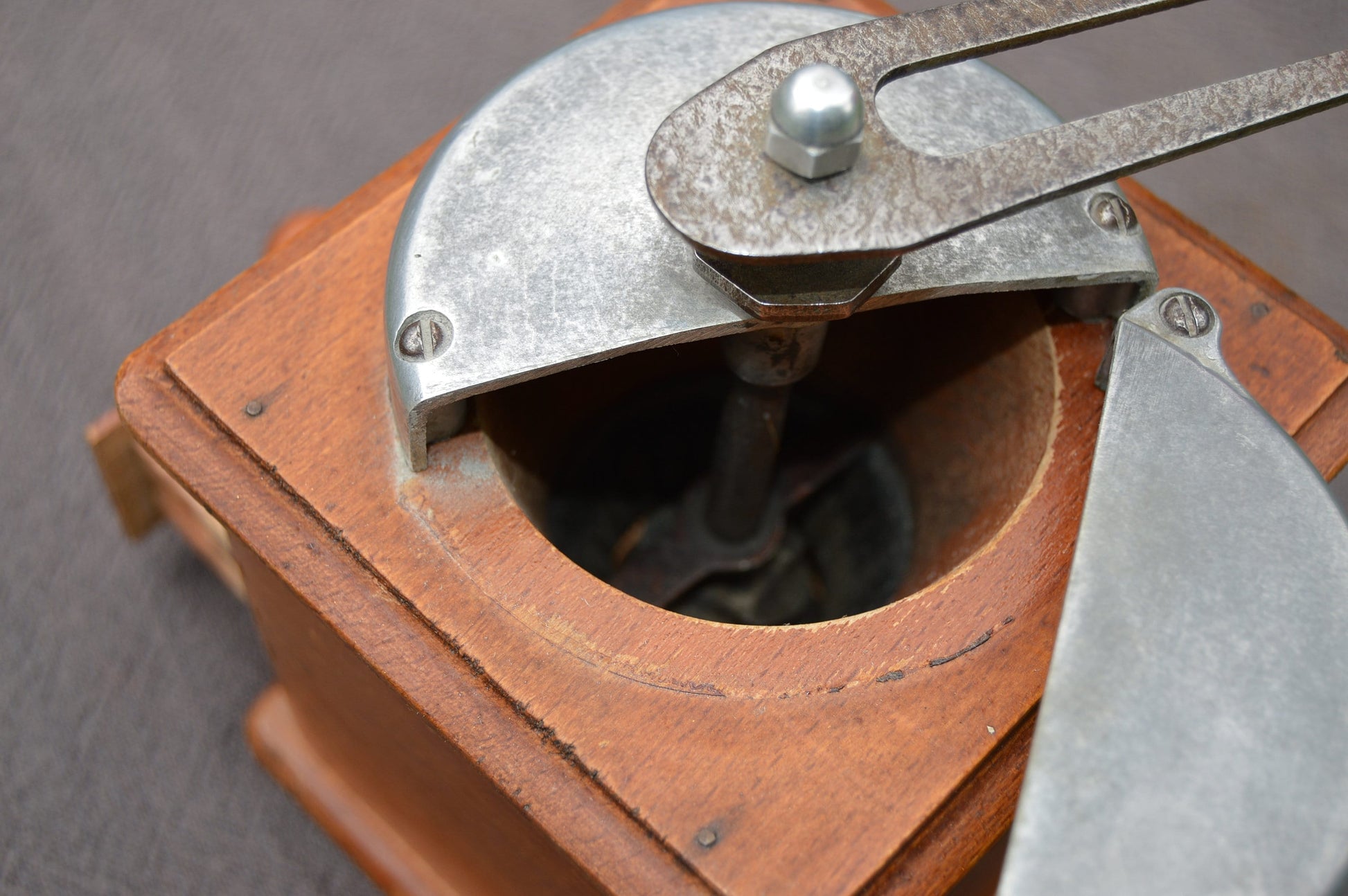 Moulin à café LMP, corps en bois et poignées en métal fonctionnant entièrement avec le tiroir, ce mécanisme robuste peut prendre de nombreuses années supplémentaires pour moudre des grains de café frais.
