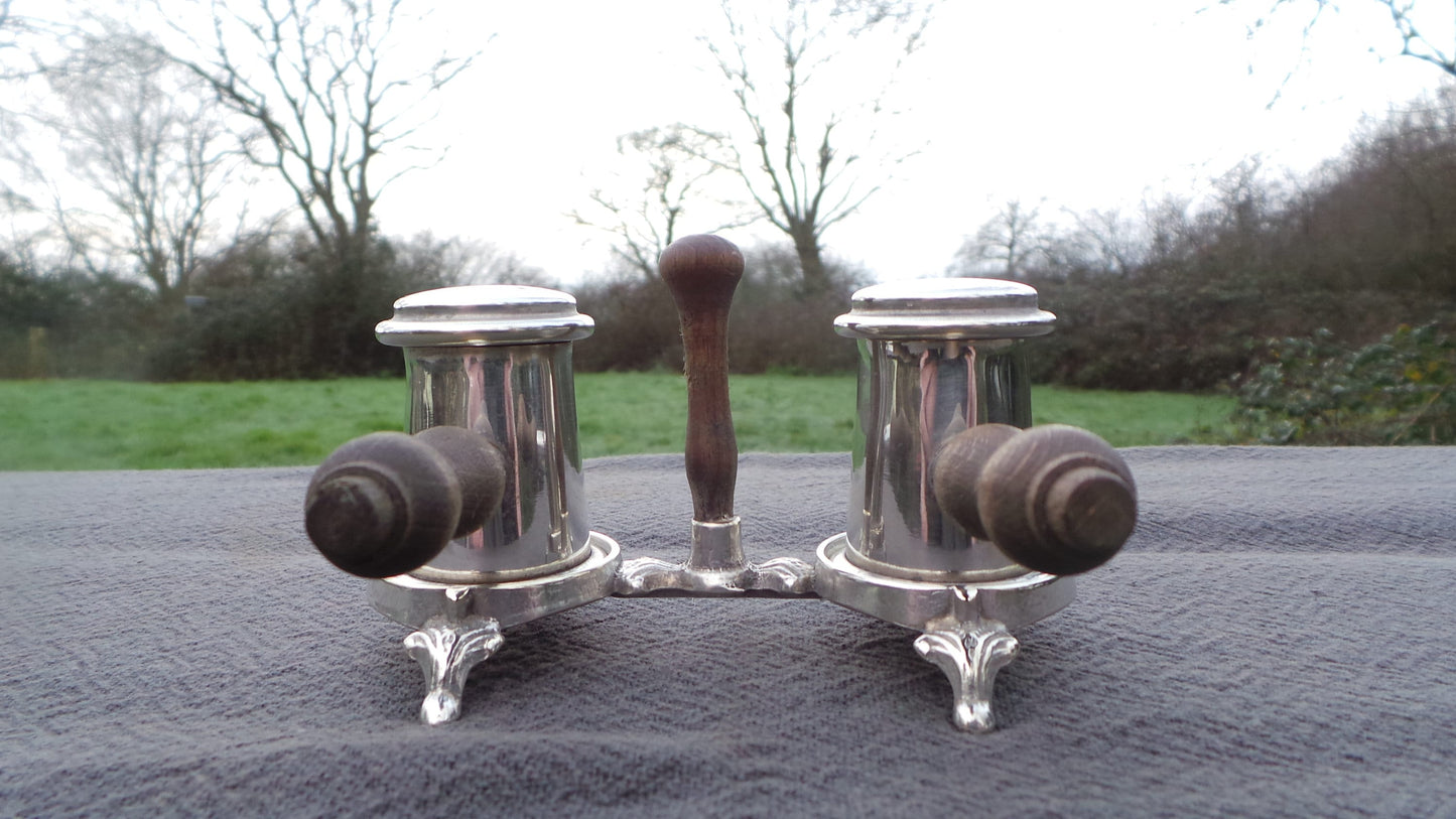 Pair Silver Plate Salt and Pepper Cruet Silver Plate and Wooden Stand Serving Set French Silver Salieres Pepperette
